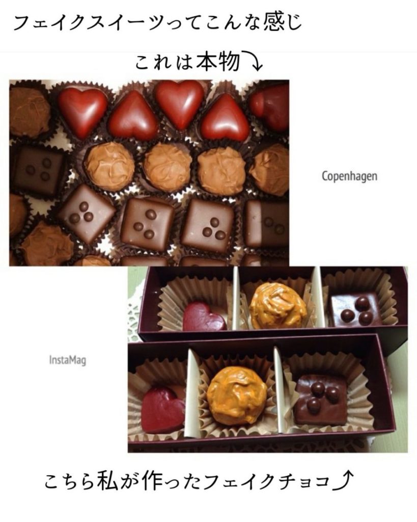 (フェイクスイーツ、上が本物で下は私が作ったフェイクチョコです)